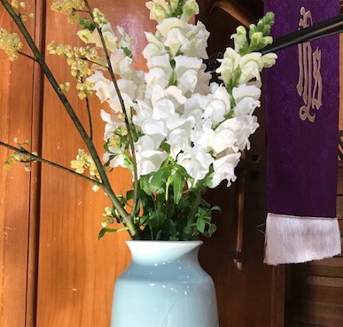 聖壇前のお花からも春の香りがただよってきます。 |
