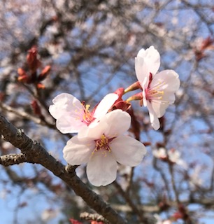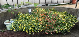 玄関前では、北の庭から移植されたビワの木と、かわいいお花がすくすく育ち、春の日差しをよろこんでいます。 |