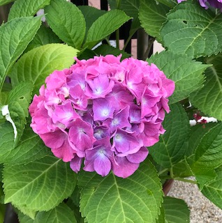 雨の中、玄関のアジサイがかわいい花を咲かせています。 |
