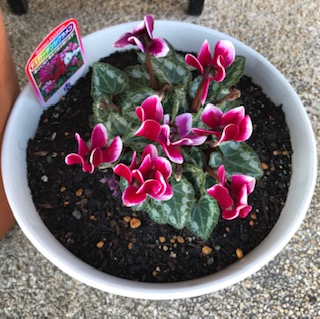 礼拝堂の前に、かわいいシクラメンが咲いています。 |